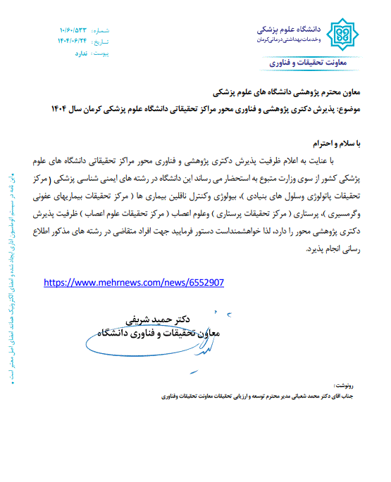 پذیرش دانشجوی دکتری تخصصی پژوهشی در مراکز تحقیقاتی دانشگاه علوم پزشکی کرمان